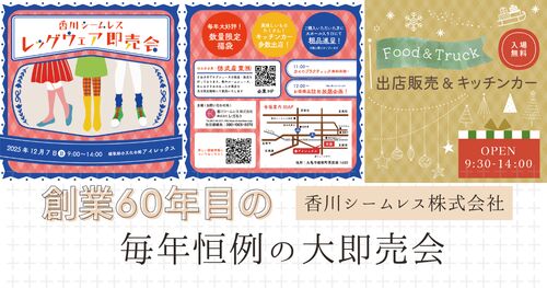 2024年も毎年恒例、年末即売会を12月1日(日)に開催いたします! 例年同様、弊社香川シームレス㈱で生産したストッキングやタイツはもちろん、ソックスやサポーター、弾性ストッキング、着圧ソックス、婦人服やインナーなどを販売します。 他社さんの出店もあ…
